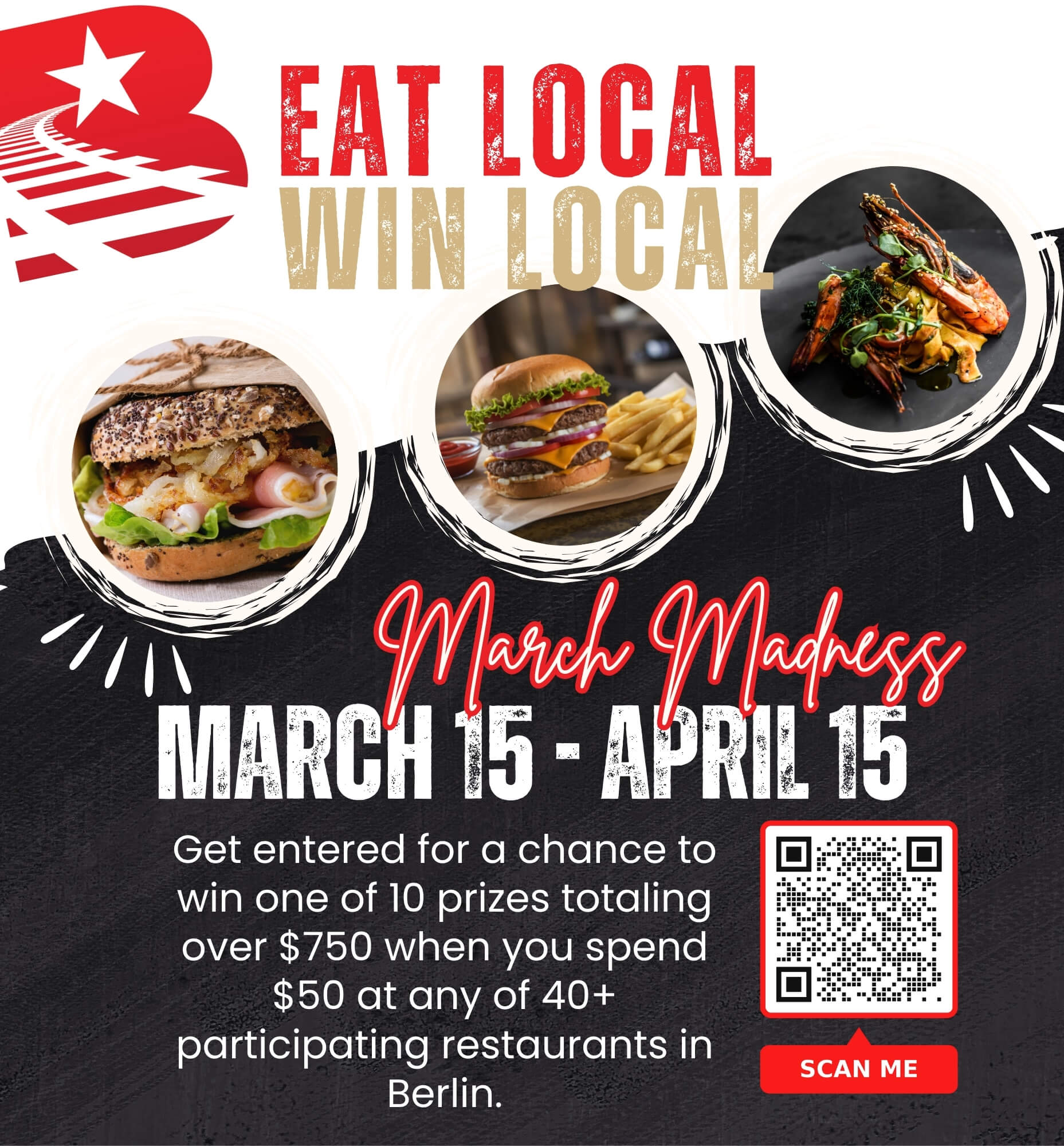 Win Local returns March 15, 2026. Spend $50 at any of 40+ participating Berlin restaurants and get entered to win one of 10 prizes totaling over $750. Support the restaurants that make Berlin special—and you could win big while doing it!
