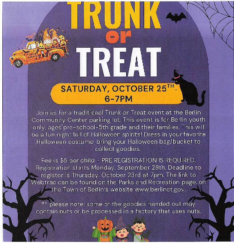Join use for a traditional Trunk or Treat event at the Berlin Community Center parking lot. This event is for Berlin youth only - ages from pre-school to 5th graders and their families! This will be a fun night full of Halloween spirits. Dress in your favorite Halloween costume and bring your Halloween bag or […]