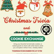 Christmas Trivia & Cookie Exchange at Coles Road Brewing on Thursday, December 18th at 6 PM. Bring your favorite homemade